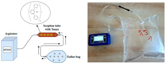 The next stage was the preparation of the collected gas samples for chemical analysis and recovery of research material, which involved collecting exhaust gases from test bags onto a sorbent in the form of Tenax. An aspirator was used for this purpose, and the exhaust gas flow was set at 20 mL/min. The aspirator technical data are provided (Table 3). Due to the fact that volatile organic compounds contained in exhaust gases are photosensitive, the samples were stored in brown bottles to minimize photolytic decomposition. The sorbent fill—Tenax—was therefore contained in a copper sorbent tube. Tenax porous polymers, based on 2,6 diphenyl-p-phenylene oxide, are widely used as an adsorbent in both air collection and gas release applications. Its unique structure provides alternative and desirable adsorption/desorption properties compared to other porous polymers []. Poly(2,6-diphenylphenylene oxide) is characterized by low leakage, low level of contamination, and high thermal stability up to 350 °C. Figure 3 shows a diagram of the exhaust gas collection process on the Tenax surface.