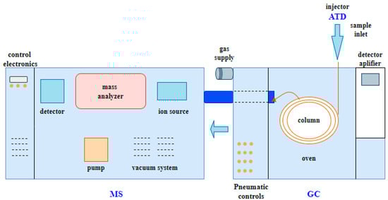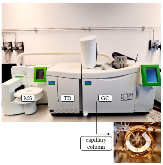 The qualitative analysis of the components isolated using a capillary column with a diameter of 0.25 mm was carried out and identified by gas chromatography (GC—gas chromatography) with thermal desorption (TD—thermal desorption) and mass spectrometry (MS—mass spectrometry) from Perkin Elmer (Kraków, Poland). The TD–GC–MS technique makes it possible to determine the composition of mixtures containing up to several hundred chemical compounds. Due to its universality, it is widely used, among others, in agriculture and pharmaceuticals. The measurement process using the TD–GC–MS technique is shown step by step in Figure 4.