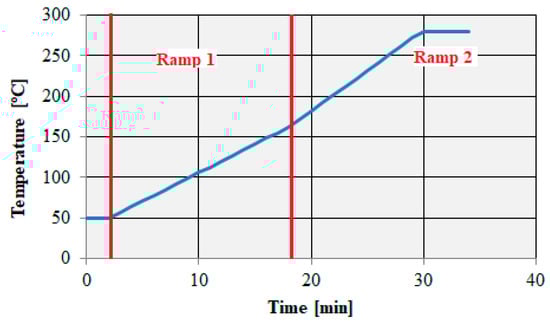 - temperature level 2: 10 °C/min to reach a temperature of 280 °C, maintained for 4.29 min (Figure 6).