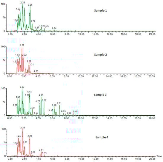 The obtained results indicated the presence of volatile organic compounds in the tested samples, including many aromatic and cyclic hydrocarbons (cycloalkanes). Qualitative analysis did not reveal significant differences in the four samples obtained (Table 5). Gasoline is a fuel that does not occur in the natural environment but is produced in primary or destructive refining processes, which means that it consists of up to several hundred substances with various physical and chemical properties. However, the main components of gasoline include aliphatic hydrocarbons with carbon atoms ranging from 5 to 12 and trace amounts of unsaturated and aromatic hydrocarbons. Therefore, alkenes and alkanes were observed in all samples, regardless of the engine operating point, as they are the main components of petroleum gases, i.e., butene, octane, heptane, hexene, and 3,3-dimethyl-1,2-epoxybutane, formed as a result of the oxidation of 4-heptanal and 2,3-dimethylhexane. These are primarily branched alkanes with long carbon chains and retention times of 1.66–1.95.