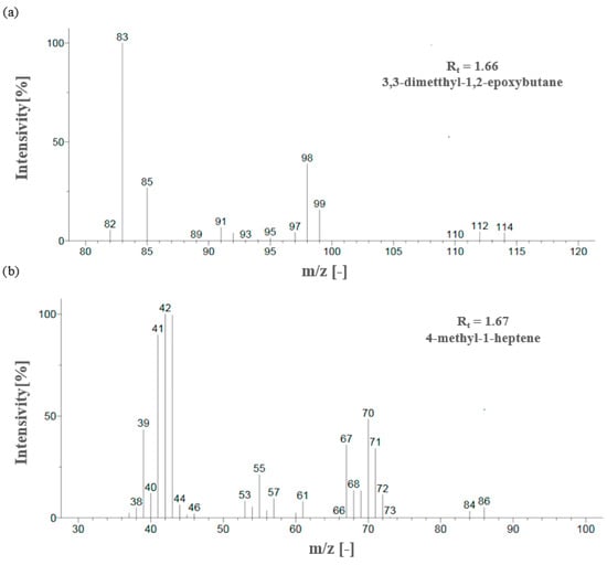 In the mass spectrum of 3,3-dimethyl-1,2-epoxybutane, the most visible molecular ion had a mass-to-charge ratio m/z = 83, while for 4-methyl-1-heptene, the ion was measured to have a ratio m/z = 42 (Figure 8a,b). The relative intensity was calculated in relation to the ion with the highest measured intensity, which was taken as the main ion and assigned an intensity of 100%. The intensities of the remaining peaks were then presented as percentages relative to the main peak.
