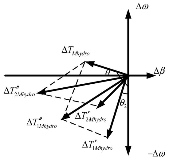The principle of negative damping generated by governor is shown in Figure 3. When is in the second quadrant, the projection on the coordinate axis is reversed with . Therefore, the mechanical torque-damping component is negative and the governor provides negative damping to the system. When the negative damping torque provided by the governor is greater than the positive damping torque provided by the other devices, the total system damping torque will be negative and ULFO will occur. When is in the second quadrant, the damping capability of the generator is improved if an additional mechanical torque is provided in the third quadrant. And, the larger the amplitude, the smaller the phase angle difference of with , the larger the positive damping component provided by , and the more obvious the effect on the system damping enhancement. In Figure 3, has a larger amplitude and smaller phase angle difference of compared to . Thus, is more effective for system damping enhancement.