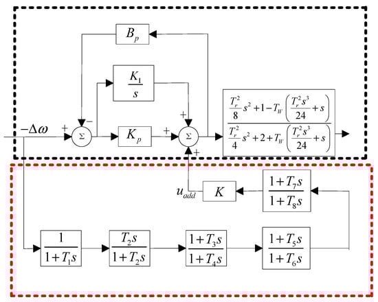 An additional damping controller is shown within the red dashed line in Figure 5. Its input signal is the system frequency deviation signal and its output signal is the additional opening reference signal , which is accessed before the mechanical system link of the governor. The phase adjustment of the original mechanical torque can be realized by adding to the output signal vector of the PID regulator.