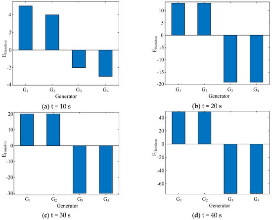 The energy increments injected into the network by generators G1–G4 are calculated and shown in Figure 9. It is obvious that the of G1 and G2 gradually increases with time, which indicates a continuous increase in the energy injected into the system. In contrast, the of G3 and G4 gradually decreases with time, which indicates a continuous decrease in the energy injected into the system. By comparing the Hamiltonian energy of the units, the ordering of the contribution of the hydroelectric units to the ULFO is assessed as G1 = G2 > G3 = G4.