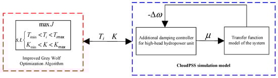 A closed-loop simulation system is built in CloudPSS considering the G1 generator governor, the additional damping controller, and the linearized model of the grid-connected system of the high-head, large-capacity unit. The structural diagram of the closed-loop model is illustrated in Figure 10. The parameters of the additional damping controller are optimized using the improved GWO algorithm. The population size is set to 50 and is 100. G2 additional damping controller time constants and gain coefficients are optimized as above. The optimized G1 and G2 additional damping controller parameters are shown in Table 3.