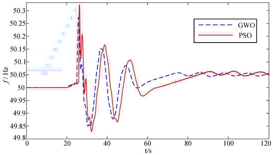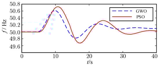 When the G1 and G2 generator governors are equipped with additional damping controllers, the same load step disturbance is simulated and the system frequency of different optimization methods is shown in Figure 11. It can be seen that when the G1 and G2 generator is equipped with additional damping controller the main vibration mode of the system frequency is almost unchanged. The damping ratio is increased from −0.003 to 0.325 and the ULFO is effectively suppressed. Furthermore, it can be seen that GWO has a better performance than PSO in optimizing the parameters of the additional damping controller, which shows the effectiveness of the proposed method.