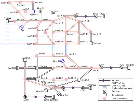 To validate the effectiveness of the proposed method on AC and DC networks, a simulation model as shown in Figure 12 is built in the CloudPSS platform. The model includes a total of 197 nodes, among which the 500 kV main grid is 85 nodes. The hydroturbine model of the high-head, large-capacity unit is accessed on Gen1A-1, Gen1A-3, and Gen1B-2, respectively. The N-1 fault between the bus1A-17 and the bus1A-13 line is set up at 25 s, at which time the system generates ULFOs. The frequency response of the system after the fault is shown in Figure 13.