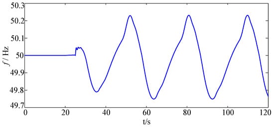 The step perturbation of the opening degree of G1 is simulated to identify the system model. At , 2% opening degree step perturbation occurs at the outlet of the G1 governor. The system frequency change is selected as the identification signal to obtain the system model based on the VMD–Hilbert identification algorithm: