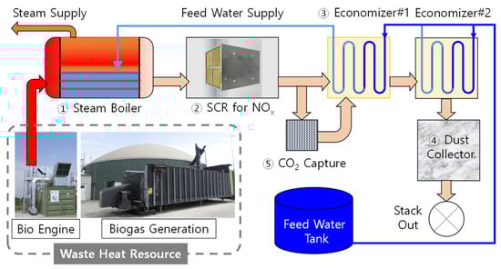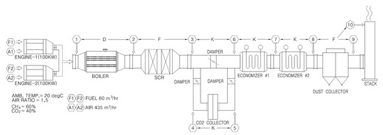 A large amount of organic waste generated in industrial complexes is reprocessed to produce biogas, and this biogas is used as fuel for gas engines and for the generation of electricity by driving generators. The produced electricity is directly used by factories in nearby industrial complexes, and the heat energy of the combustion gas emitted from engines is recovered as much as possible through heat exchangers, such as boilers and economizers, to produce hot water and superheated steam. In addition, nitrogen oxides, carbon dioxide, and dust contained in the exhaust gas are purified through selective catalytic reduction (SCR), CO2 capture by using dry calcium hydroxide (Ca(OH)2), and dust collection processes; then, they are released into the atmosphere. The core device of the exhaust gas waste heat recovery system of the biogas engine consisted of a heat recovery device consisting of a boiler and an economizer, as well as a purification device that used SCR, carbon capture, and a dust collector; Figure 2 shows a system design diagram of each component in the assembly.