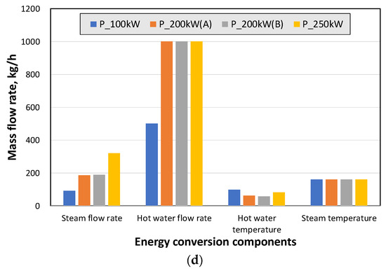 The waste heat recovery efficiency is defined in Equation (7), and it is usually proportional to the engine size, but the optimal operating conditions involved maximizing the output of superheated steam and hot water at the same engine size under the given constraints. As shown in Table 3 and Table 4, two cases (200A vs. 200B) using two 100 kW engines were compared. In the case of 200B, the temperature of the hot water supplied by the first economizer (first ECO) was increased to increase the production of superheated steam by the boiler, and in this case, the outlet temperature of the hot water produced by the second economizer (second ECO) in the final stage was lowered. In the repeated calculation process for various flow rates and temperature conditions, the WHR system’s heat recovery efficiency in the case of 200A was found to be 30.76%. This result was optimal for a heat exchanger that maximized the production of superheated steam with 10 °C of superheating, and the flow rate and outlet temperature of the hot water and steam in the three heat exchangers were optimal. Based on the above results, the 200A case was selected as the optimal operating condition of the WHR system, and the capacity of the heat exchanger was determined. The waste heat recovery efficiency calculated according to each capacity of the engine and the production of steam and hot water using the recovered heat were compared with each other. Figure 5 shows the results of the comparison of the heat recovery in the waste heat recovery system and the energy recovery efficiency according to changes in engine power. Figure 5a,b confirms that as the engine’s power capacity increased, the production of superheated steam (steam) naturally increased in proportion to it (100 < 200 < 250 kW). In addition, as shown in Figure 5c, the heat recovery efficiency was the largest at 250 kW, but as shown in Figure 5d, the production efficiency of steam was slightly higher at 200 kW. It can be seen that using two 100 kW power engines (P_200A case) provided the highest heat recovery efficiency and steam production. Based on the above calculation results, a detailed design of the heat exchangers of boilers and economizers for the production of feed water and steam was performed.