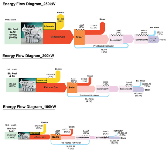Sankey diagrams were used to analyze the energy flow and conversion efficiency of various waste heat recovery systems, power plants, and industrial processes. Figure 6 shows the energy flow of a WHRS with a Sankey diagram by quantifying the waste heat recovery at each stage. The comparison of the recovered heat for each engine size is intuitive, and the areas in the figure are proportional to the power, so this helps one understand the energy conversion and loss. These diagrams can visually represent energy flows and help identify areas for energy conservation and optimization.