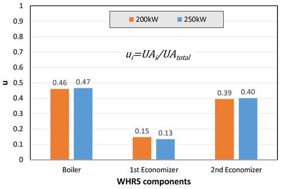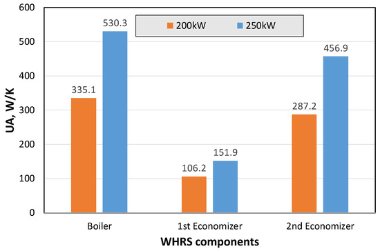 In the process of designing the waste heat recovery system, when the temperature and flow conditions of the exhaust gas were determined, the conditions for maximizing the amount of waste heat recovered and the efficiency also needed to be determined. As an objective function, it was important to determine the supply temperature of hot water and steam produced by the waste heat recovery system. In addition, determining the appropriate size of the heat exchanger is an important design process when optimizing the performance of a heat exchanger that performs three different functions. Figure 7 and Figure 8 compare the heat transfer capacity calculated in the heat exchanger design process and the results of the optimal design variables. Figure 7 shows the heat exchanger capacity calculated with Equations (8) and (9), which means the product of the heat transfer area () and the total heat flow rate (). And Figure 8 shows the capacity of each heat exchanger in percentages for each capacity of the two engines. The value of was 728.5 W/K in the 200 kW power engine and 1139.1 W/K in the 250 kW power engine; the rate at which the capacity of the heat exchanger increased was 156.4%, while the rate at which the engine size increased was 125.0%. This meant that the larger the engine size, the greater the production of superheated steam, which improved the efficiency; therefore, the capacity of the heat exchanger also needed to increase.