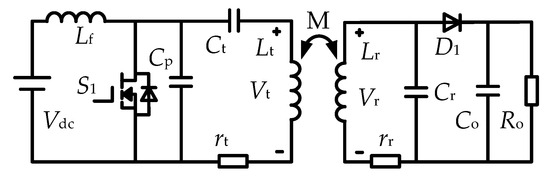 Figure 3a depicts the inductive power transmission link schematic with series and parallel (SP) compensation, where Cr and Ct are the parallel- and series-compensated capacitors, Lt and Lr are the transmitter and receiver coils, rt denotes the equivalent series resistance (ESR) of the transmitter coil, rr represents the ESR of the receiver coil. To maximize the power transmission efficiency, the receiver and transmitter coils are operated at the resonant frequency [32]. The resonant frequency is calculated as follows.