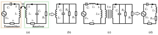 The receiver circuit needs to be reflected in the transmitter circuit to facilitate calculation, as illustrated in Figure 3d. When the receiver operates at its resonant frequency, the reflected resistance Rref is expressed as follows.
