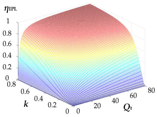 Figure 4 shows the inductive power transmission link’s total efficiency ηIPT changing trend with different k and Qt values. It is evident that the larger values of k and Qt are beneficial for improving the power transmission efficiency of the inductive power transmission link. Moreover, the efficiency of ηIPT is also enhanced as Qr increases. These trends indicate that a stronger coupling and higher quality factor lead to better overall efficiency in WPT. Figure 5 illustrates the changing trends of the efficiencies ηr, ηt, and ηIPT with different RL values. As the RL increases, the receiver efficiency ηr decreases, while the transmitter efficiency ηt exhibits an increasing trend. The inductive power transmission link system’s overall efficiency reaches its maximum efficiency at an optimal RL value range, as highlighted in the green shaded region of Figure 5.