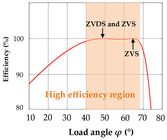 The efficiency of the Class-E PA by sweep load angle φ is shown in Figure 7. It indicates that the efficiency can reach 1 when the φ is about 49°, which corresponds to the optimally tuned state for the Class-E PA. In this state, both the ZVS and ZVDS characteristics are satisfied, and the optimal values of Cp and Ct can be obtained by Equation (9) [35]. On the other hand, the efficiency is close to 1 when the φ is about 64.5°, and the ZVS characteristics are satisfied.