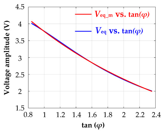 According to Equations (10)–(13), the φ is directly related to Veq. However, if φ is substituted directly into Equation (10), the expression about the relationship between φ and Veq becomes very complicated. Thus, a mathematical fitting method is considered to obtain an equivalent expression. Using a math-fitting tool, the relationship between tan(φ) and Veq_m can be denoted as follows.