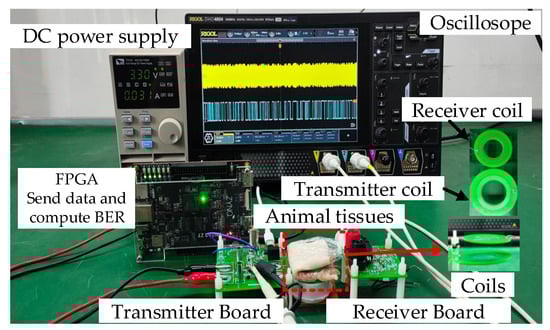 The proposed WPDT with an ASK modulation circuit scheme has been implemented using the experimental platform depicted in Figure 10. The MOSFET selected for the prototype is the BSS138PW from Nexperia, benefiting from its advantageous characteristics, such as a low output capacitance of 7 pF and a small on-resistance of approximately 1.2 Ω. The prototype employs TDK’s C0G capacitors with a capacitance tolerance of 1%. This capacitor material demonstrates outstanding high-frequency characteristics and minimal parameter errors. High-frequency inductors with a self-resonant frequency surpassing 300 MHz have been selected to alleviate the impact of parasitic capacitance. For measurements, a RIGOL oscilloscope with bandwidths of 800 MHz, along with a passive probe with 500 MHz bandwidth, is employed to capture high-frequency signals within the circuit accurately. To minimize measurement errors, the ground wire of the passive probe is substituted with a grounding spring band, ensuring a robust ground connection and enhancing the reliability of measurement data. Additionally, the distance between the transmitter and receiver coils is designed to be 6 mm, considering factors such as the thickness of the body’s skin and fat layers. Detailed and tuned parameters are cataloged in Table 1. Furthermore, the FPGA board is employed in this experimental setup to generate the random data signal and compute the BER.