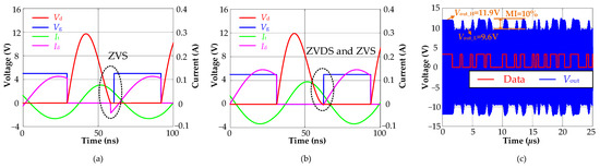 Figure 11 demonstrates the ZVDS and ZVS features during different data conditions. The drain-source voltage (Vd) of S1, the gate-source voltage (Vg) of S1, the resonant current (It), and the drain-source current (Id) of S1 are shown in Figure 11a,b. Figure 11a depicts the waveforms of Vd, Vg, It, and Id when the data signal was at a high level. It is apparent that the S1 satisfies the conditions of ZVDS and ZVS. Similarly, these waveforms are depicted in Figure 11b when the data were at a low level. Clearly, the S1 can achieve ZVS in this state. Additionally, the resonant current waveform exhibits high sinusoidal behavior due to the design of a high load quality factor QL for Class-E PA, reducing the reactive power loss.