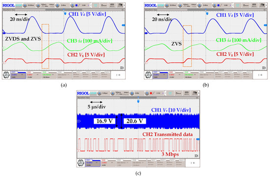 Figure 12 depicts two experimental waveforms of modulation state, showcasing Vd, Vg, and Id. When the data signal was at a high level, the Class-E PA operates in the optimally tuned state, which satisfies the ZVDS and ZVS features, as demonstrated in Figure 12a. The same waveforms for the sub-optimally tuned state when the data signal was at a low level are illustrated in Figure 12b, which satisfies the ZVS conditions.