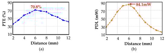 The total power transmission efficiency and output power were investigated at a data rate of 3 Mbps for different distances d between the receiver and transmitter coils. The experimental results are presented in Figure 14. When d = 6 mm, the power transmission efficiency reaches its maximum value due to the Class-E PA being designed for the tuned state. The maximum power transmission efficiency and output power reach 70.8% and 84.1 mW, respectively. As d increases from 6 mm, the coupling coefficient decreases, resulting in a reduction of the induction voltage of the receiver coil and a detuned state for the Class-E PA. Consequently, both power transmission efficiency and output power exhibit a decreasing trend as d increases. Conversely, as d decreases from 6 mm, the coupling coefficient k increases, and the reflected resistance Rref increases. Meanwhile, the Class-E PA also operates in a detuned state. As a result, both power transmission efficiency and output power exhibit a decreasing trend with decreased d.