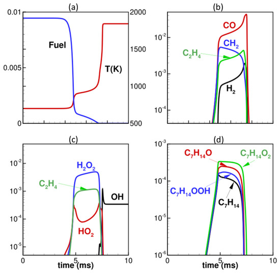 To demonstrate the proposed hybrid chemistry approach, we contrast the temporal evolutions of fuel-specific intermediates and other species to temperature during the homogeneous ignition of n-heptane during LTO. They are obtained from the simulations of a simple reactor model based on homogeneous chemistry at constant volume, using Senkin [28] and the detailed mechanism proposed by Mehl et al. [29]. Figure 1 shows the temperature and species mole fraction profiles during n-heptane LTO based on the initial conditions of 700 K, 20 atm, and a mixture equivalence ratio of 0.5. The species shown in Figure 1 account for some of the higher species concentrations during all phases of LTO. Figure 1d shows the fuel-derived intermediates, while Figure 1b,c show other intermediate species with lower chemical complexity, including the usual species found in the fragment list for high-temperature chemistry combined with CH2O, HO2, and H2O2. These species exhibit the mechanistic phases of the ignition process, including the two stages of ignition. More importantly, the simpler species account for the bulk of the composition within the mixture, while the fuel-derived intermediates (e.g., C7H15O2, C7H14, C7H14O, and C7H1OOH for n-heptane) account for much smaller fractions of the composition of the original fuel at their peaks between the two ignition stages. Toward the start of the second stage, the fuel-derived intermediates are depleted at a faster rate than other species, such as CO, H2, CH2O, and C2H4. These results support our proposed hybrid chemistry approach. Tracking the initial stages of fuel oxidation using a common set of simpler hydrocarbons and other species, which also track the bulk of the mixture, can potentially delineate the various stages of fuel oxidation and account for the bulk of the atoms in the mixture.