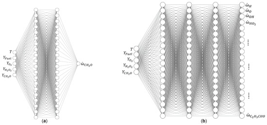 Figure 2. Illustration of the ANN architectures: (a) ANN architecture for CH2O prediction; (b) ANN architecture for the remaining reaction rate prediction.