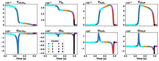 Figure 3. Homogeneous data clustering: species mass fraction and reaction rate temporal profiles during the oxidation of n-heptane, where ϕ = 0.8, T = 700 K, and p = 20 atm.