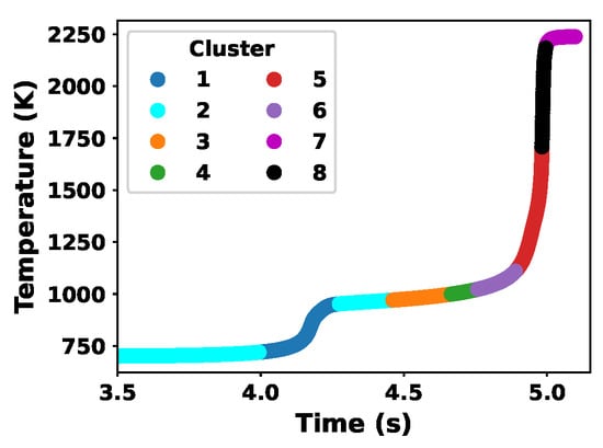 Figure 4. Homogeneous data clustering: temperature temporal profile during the oxidation of n-heptane, where ϕ = 0.8, T = 700 K, and p = 20 atm.