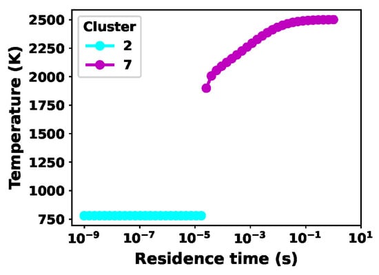 Figure 6 shows the clustered mass fractions (top row) and reaction rates (bottom row) for the fuel, O2, H2O2, and CH2O and Figure 6 shows the clustered temperature. Unlike the homogeneous reactors where eight clusters are identified, here, data are only found in Clusters 2 and 7. This is due primarily to the initial separation of the data into two categories based on the stages of ignition, as described in Section 2.3. Additionally, all data after ignition are included in Cluster 7. The reaction rates of the PSRs are 1 to 2 orders of magnitude smaller than those of the homogeneous reactors; therefore, they are close to zero, which is why they fall into Cluster 7.