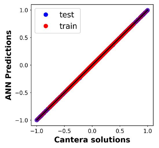 Figure 7. Training (red symbols) and test (blue symbols) data scatter plot of Cantera and ANN-predicted reaction rates. The black line represents the line of best fit.