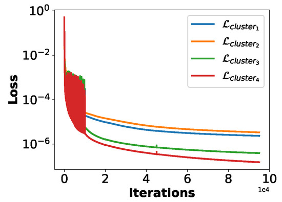 We investigate the generalization of the ANNs by predicting test and training datasets. The scatter plot in Figure 7 shows good correlation between the actual Cantera and ANN-predicted reaction rates. Here, the models are trained using data obtained by solving Equations (1)–(4) with the initial temperatures of 700, 740, 780, 820, and 860 K for equivalence ratios of 0.8, 1, and 1.2 and tested using the initial temperatures of 720, 760, 800, and 840 K for the same equivalence ratios. Figure 8 shows the evolution of the loss functions as a function of the epochs or iterations for the first four clusters. Training for Clusters 5 to 8 also exhibits similar behavior. At around 20,000 iterations, the loss function becomes somewhat “steady” and no longer decreases. Decreasing the learning rate and weight decay improves the network’s training and decreases the loss function. Table 2 shows the training losses.