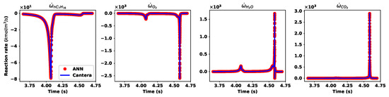Figure 9. Comparison of the ANN-predicted and Cantera reaction rates for the homogeneous reactor, with an initial temperature of 700 K and an equivalence ratio of 1.