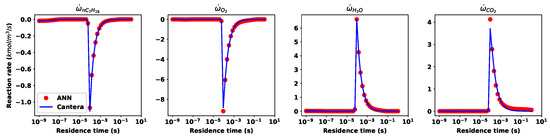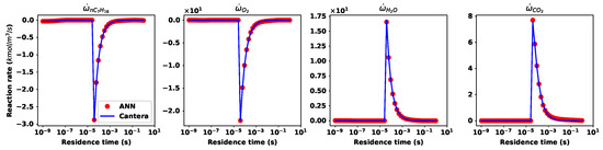 Figure 11. Comparison of the ANN-predicted and Cantera reaction rates for the PSR, with an initial temperature of 700 K and an equivalence ratio of 0.8.