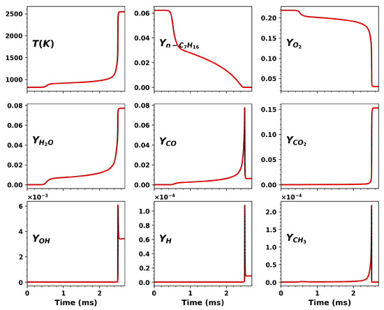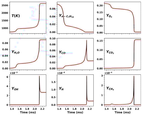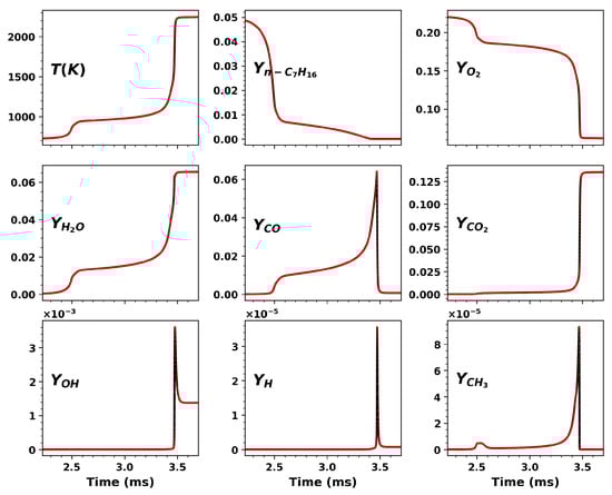 We demonstrate the hybrid chemistry approach by comparing a posteriori simulations to detailed chemistry data using the homogeneous reactor. The foundational chemistry is based on the C0–C4 USC Mech-II mechanism [42], with 111 species and 784 reactions. The governing Equations (13)–(15) are integrated using Cantera [43]. To demonstrate the hybrid chemistry scheme, we show the results of simulations with initial temperatures of 740 K and 820 K and an equivalence ratio of 1. These two sets of conditions are included in the training data. We also show results with an initial temperature of 720 K and an equivalence ratio of 0.8 to demonstrate the model’s ability to interpolate. Figure 12, Figure 13 and Figure 14 show comparisons of the temporal profiles of the detailed mechanism calculations (solid black) and those of the hybrid scheme (dotted red) for the temperature and select species mass fractions under these initial conditions.