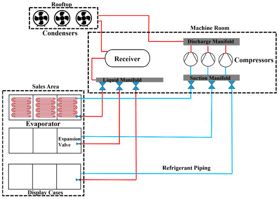 Schematic diagram of a typical supermarket refrigeration system. Red represents the high-pressure side of the piping system, whereas blue indicates the low-pressure side.