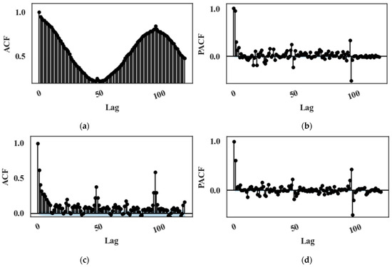 For each dataset, a partial correlation analysis is performed for each target parameter to select appropriate input features and mitigate the effect of multicollinearity. Autocorrelation function (ACF) and partial autocorrelation function (PACF) plots are analysed to determine the optimal number of lagged features required for the model. Figure 2a,b depict the ACF and PACF plots of an input feature, and Figure 2c,d show the ACF and PACF plots of a target feature, respectively. A significant autocorrelation is also observable at the 96th lagged value, corresponding to the same time on the previous day. Moreover, L2 regularization is used to prevent overfitting.