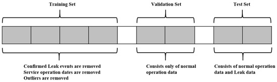 The leak events, service incidents, and other special events (e.g., power outages) are identified first for a given dataset. Then, the dataset is divided into training, validation, and test sets. Usually, a test set is selected to include a leak event. Therefore, only one month of data is used to detect catastrophic leaks, and, for slow leak detection, two months of data are selected in the test set. The training and validation sets are selected to include only normal (non-leak) operation data without outliers. Depending on the availability of data, two to three months of data are used for the training set, while fifteen to thirty days of data are used for the validation set. A gap is maintained between each set to stop the possibility of data leakage due to the use of the lagged values (Figure 3).