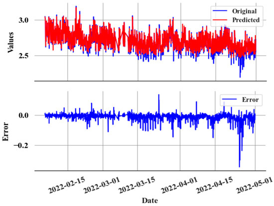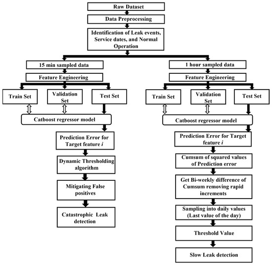 The CatBoost regression model is used to construct the predictive model , utilizing the 1 h sampled data, thus establishing the relationship during normal operations, where denotes the residual error. As the system enters a slow leak state, changes in the correlations between and result in the prediction error given in Equation (7):