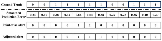 In the context of refrigeration leak detection, a leak is often an anomalous segment. When evaluating similar time-series anomaly detection models, the point adjustment protocols [42] are used; this is because the detection of the anomalous segment is the ultimate objective. For refrigeration leak detection specifically, the time of the leak event plays a crucial role. When calculating precision and recall, it is essential to penalise any delayed discoveries. Therefore, a modified point adjustment protocol is used in this study. All points within the anomalous region after the first successfully detected anomalous point are marked as successfully detected anomalous points, regardless of whether they were accurately captured by the model or not. An example of this protocol is shown in Figure 5, and 0.5 is used as the threshold. The first row represents the ground truth with 12 points, and, within the shaded square, two anomalous segments are highlighted. The second row displays the smoothed prediction error values. The third row presents the point-wise detector results with the specified threshold. Finally, the fourth row showcases the detector results after adjustment.