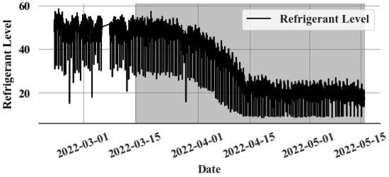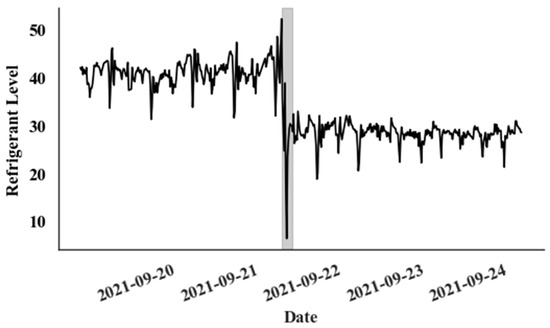 A single event that occurred in a Canadian supermarket is used to evaluate the proposed model for detecting catastrophic leaks. During this leak event, as depicted in Figure 6, the refrigerant level drops dramatically from 40% to 30% within just a few hours.