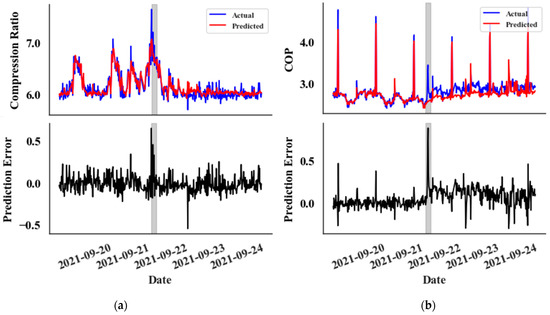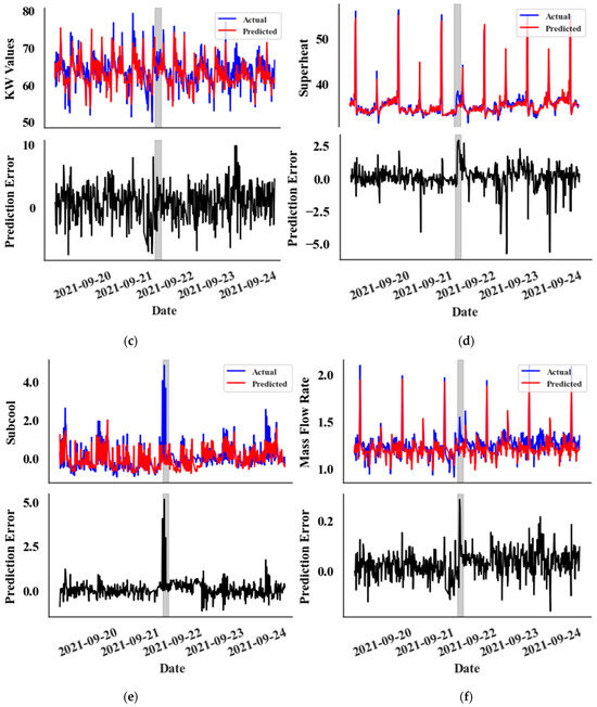 In the prediction error graphs (lower graphs), an anomaly is noticeable at the very onset of the leak in both the compression ratio (Figure 7a) and subcooling temperature (Figure 7e) metrics. However, the anomaly appears with a slight delay for all other features, except the kW value. Interestingly, the kW graph (Figure 7c) does not exhibit a clear distinction from random noise. This delayed anomaly detection impacts the overall timing of identifying abnormalities.