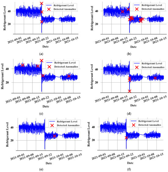 Upon generating predictions from the CatBoost regression model, prediction errors are fed into the nonparametric dynamic thresholding algorithm. This process helps to identify the anomalous points of selected target parameters. Subsequently, these identified anomalous points are superimposed on the graph, representing the refrigerant level values of the receiver. This allows for a clear assessment of the anomaly detection model’s performance (In Supermarket 1, the refrigerant level values at the receiver tank are available. They are not used in any of the modelling. This is used only for the clear visualization of the performance of the anomaly detection model). Figure 8 showcases the efficacy of the non-parametric dynamic thresholding algorithm when it is applied to a dataset containing a leak event before making the point adjustment. The red crosses on the graph signify instances where the model flagged an anomaly.