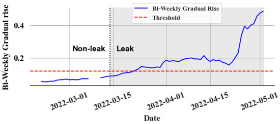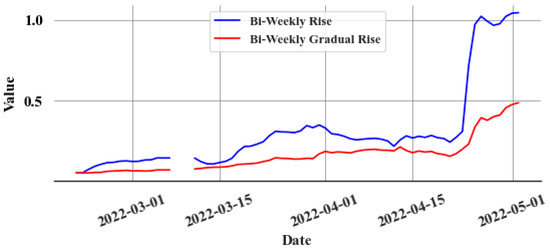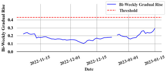 Gradient of and the rolling mean and the standard deviation of the gradient are calculated over a two-week window. Rapid increases in values are identified when . The amount of rapid increase and the bi-weekly sum of rapid increases are computed. The bi-weekly rise, which is due to gradual increases , is then calculated, as shown in Equation (9):