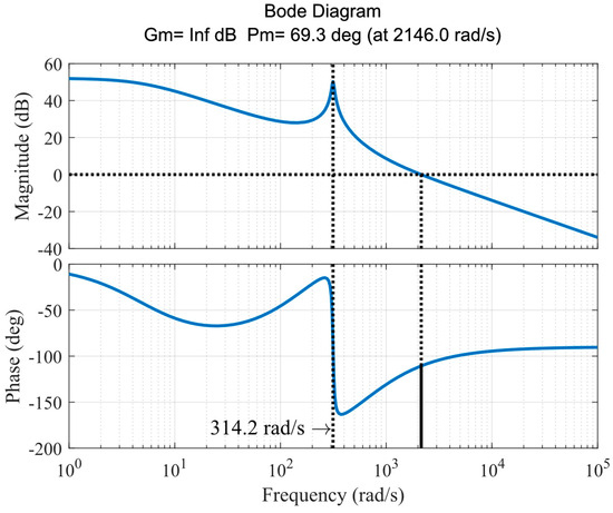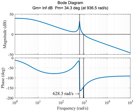 Given the coefficients , the Bode plot of the fundamental circulating current control is presented in Figure 6 with a good gain margin and a phase margin of 69.3° at a frequency of 2146 rad/s. The resonant frequency can be observed at 314.2 rad/s. Similar to the second-order circulating current eliminator, the magnitude decreases while the frequency increases, but it is pulled up at the fundamental resonant frequency. This particular characteristic shows the enhanced tracking capability of the fundamental circulating current to balance the SoC between the upper and lower arms.