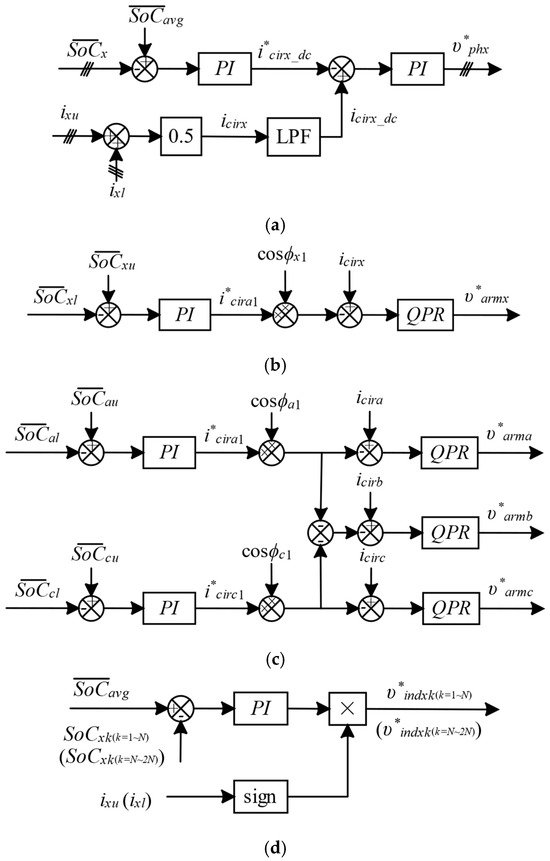 where and are the proportional and integral gains of the inner-loop arm SoC controller, respectively. Similarly to the circulating current controller, the QPR controller is adopted to regulate the fundamental harmonics. The final modulation reference of the arm SoC balancing control is expressed as follows:
