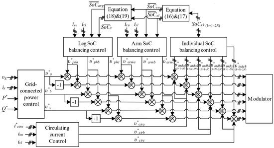 The control system of the MMC-BESS comprises grid-connected power control, circulating current control, and SoC balancing control. The grid-connected power control is the control top level, which regulates the power exchange between the grid and BESS with a desired output voltage following the grid. The circulating current control is responsible for eliminating the circulating current flowing within the converter, which can be disadvantageous in the steady state of the MMC-BESS. The SoC balancing control consists of three parts: the phase SoC balancing control, the arm SoC balancing control, and the individual SoC balancing control. With the benefit of the SoC balancing control, SoC equalization can be achieved among the phases, arms, and submodules.