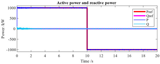 The important input signals of the MMC-BESS system are the active power and reactive power references, which are carried as [−1 MW, 1 MW] and [0 W, 0 W] at time [0 s, 10 s], respectively, as shown in Figure 8. P and Q present the actual active power and reactive power, respectively. Under the regulation of the power controller, the actual active power and reactive power are forced to track the reference values.