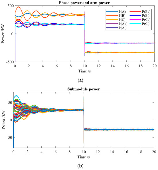 To better explore the power flow and conversion of the MMC-BESS, the power distribution among phases, arms, and individual submodules is demonstrated graphically in Figure 9. The phase power and arm power (Figure 9a) are not equally distributed among phases and arms initially, which happens because at the start of the operation, the phase and arm SoC profiles are not balanced. As aforementioned in the balancing control, more power would be captured by the phase/arm with less SoC, and vice versa. Similarly, Figure 9b provides the individual submodule power distribution of the MMC-BESS. After realizing the SoC balancing, the power is equally distributed among the phases, arms, and individual submodules.