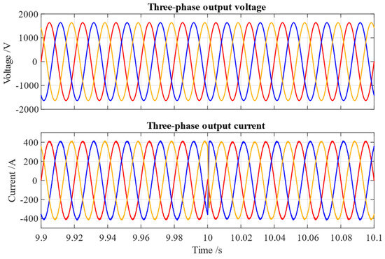 Under the command of the grid-connected power control, the output voltage of the MMC-BESS matches the rotating grid voltage, and the output current is forced to follow the voltage to contribute to the target power in the charging mode and inversely align with it in the discharging mode, as shown in Figure 10.